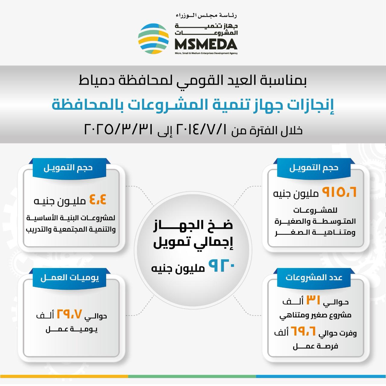 وأضاف رئيس جهاز تنمية المشروعات أن الجهاز يتعاون مع المحافظة لإتاحة المنتجات التمويلية المتنوعة اللازمة لأصحاب المشروعات والشباب، حيث ضخ الجهاز خلال الفترة من يوليو 2014 وحتى مارس 2025 تمويلات بلغت حوالي 920 مليون جنيه تم من خلالها تمويل 31 ألف مشروع متوسط وصغير ومتناهي الصغر أتاحت حوالي 70 ألف فرصة عمل بالإضافة إلى مشروعات البنية الأساسية والتنمية المجتمعية والتدريب التي وفرت 29 ألف يومية عمل للعمالة غير المنتظمة وساهمت في تهيئة البيئة المناسبة للتوسع في المشروعات الصغيرة.