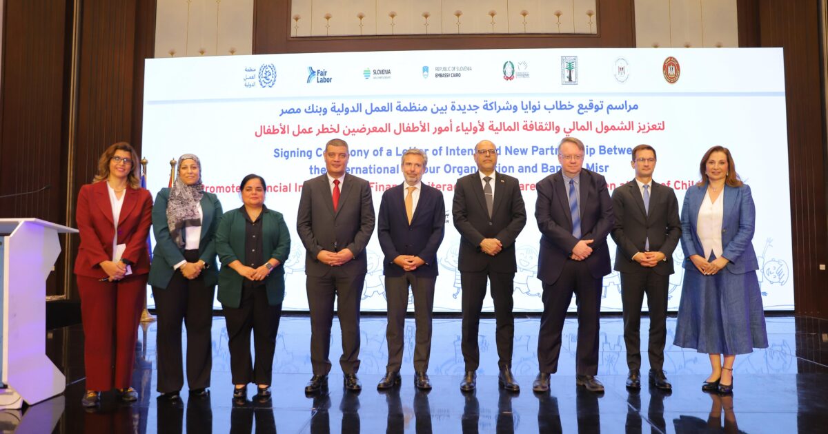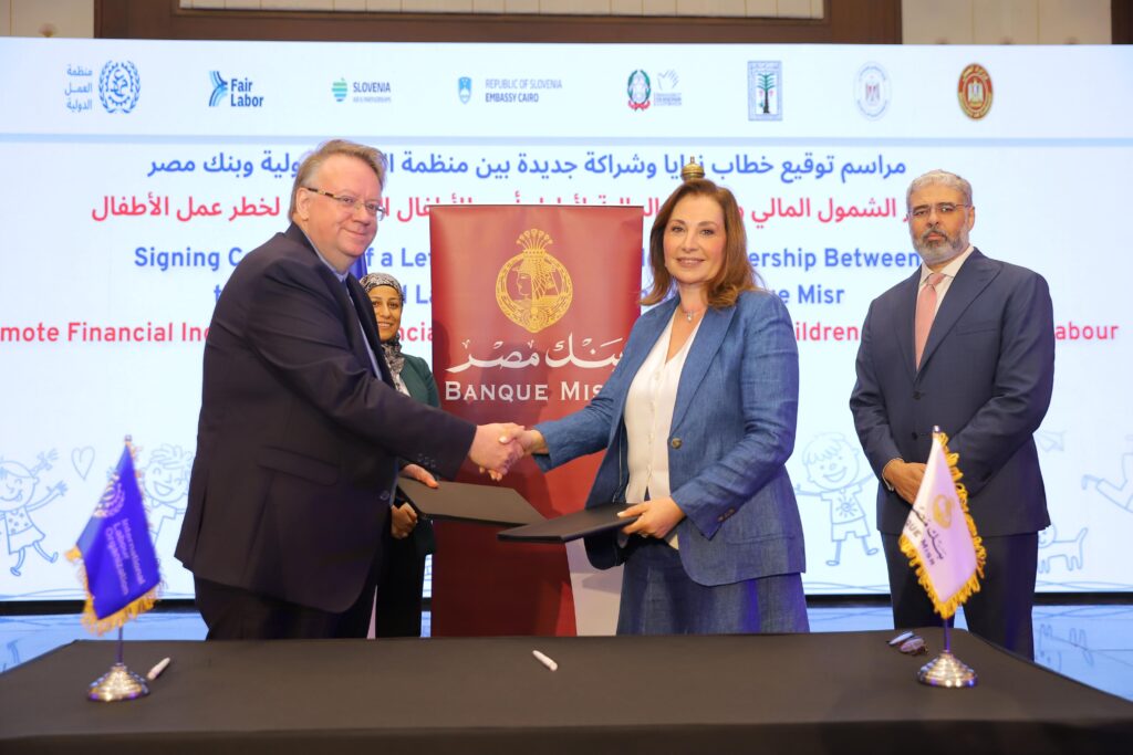 في اطار خطة بنك مصر لدعم جهود الدولة لتعزيز الشمول المالي والقضاء على عمل الأطفال، قام البنك مؤخرا بتوقيع بروتوكول تعاون مع منظمة العمل الدولية ، وذلك ضمن إطار مشروعات المنظمة لمكافحة عمل الأطفال،حيث قامت هند فهمى رئيس قطاع الشمول المالي والتمويل العقاري ببنك مصر بتوقيع بروتوكول التعاون مع إيريك أوشلا مدير مكتب منظمة العمل الدولية بمصر، وقد حضر التوقيع لفيف متميز من قيادات بنك مصر ومنظمة العمل الدولية وممثلي السفارة الإيطالية و سفارة سلوفينيا بجمهورية مصر العربية.