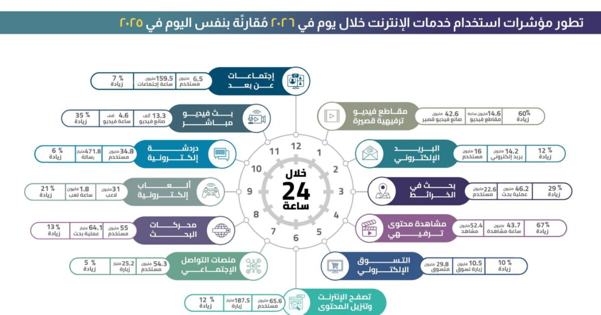 وفي السياق ذاته، سجلت منصات التواصل الاجتماعي نحو 54.3 مليون مستخدم يوميًا، بإجمالي 25.2 مليار زيارة، ما يعكس استمرارها كأحد أهم أدوات التواصل والتفاعل المجتمعي، رغم تباطؤ معدل نموها مقارنة ببعض الخدمات الأخرى. كما بلغت عمليات البحث عبر الإنترنت نحو 64.1 مليار عملية يوميًا، مع 55 مليون مستخدم، وهو ما يشير إلى الاعتماد المتزايد على الإنترنت كمصدر أساسي للمعلومات.