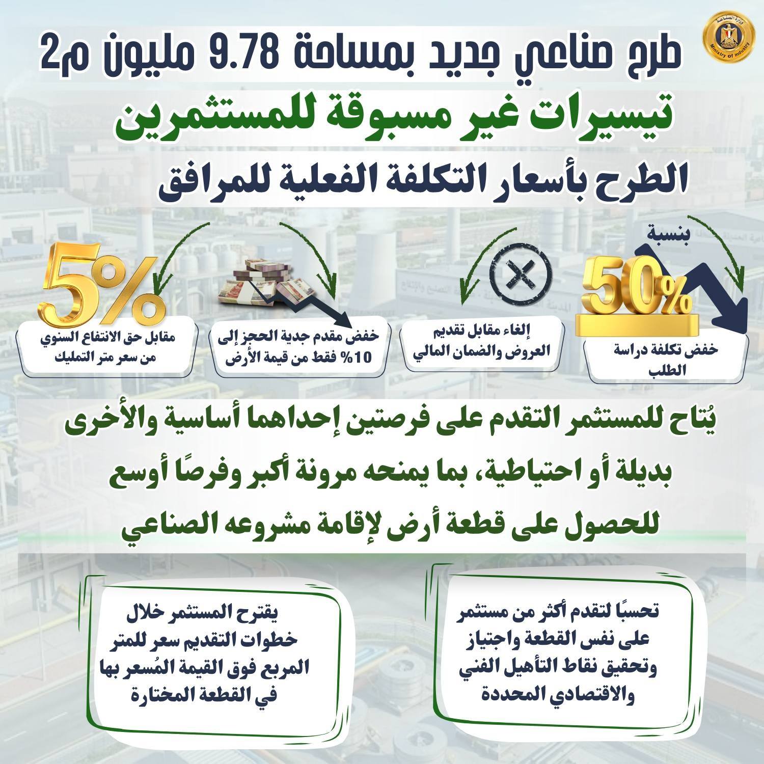 – تواصل الوزارة تقديم حزمة من التيسيرات والحوافز للمستثمرين، أبرزها خفض تكلفة دراسة الطلب بنسبة 50%، وإلغاء مقابل تقديم العروض والضمان المالي، وتخفيض مقدم جدية الحجز إلى 10% فقط من قيمة الأرض، فضلًا عن تبسيط نموذج دراسة الجدوى، كما يُتاح للمستثمر التقدم على فرصتين إحداهما أساسية والأخرى بديلة أو احتياطية، بما يمنحه مرونة أكبر وفرصًا أوسع للحصول على قطعة أرض لإقامة مشروعه الصناعي.