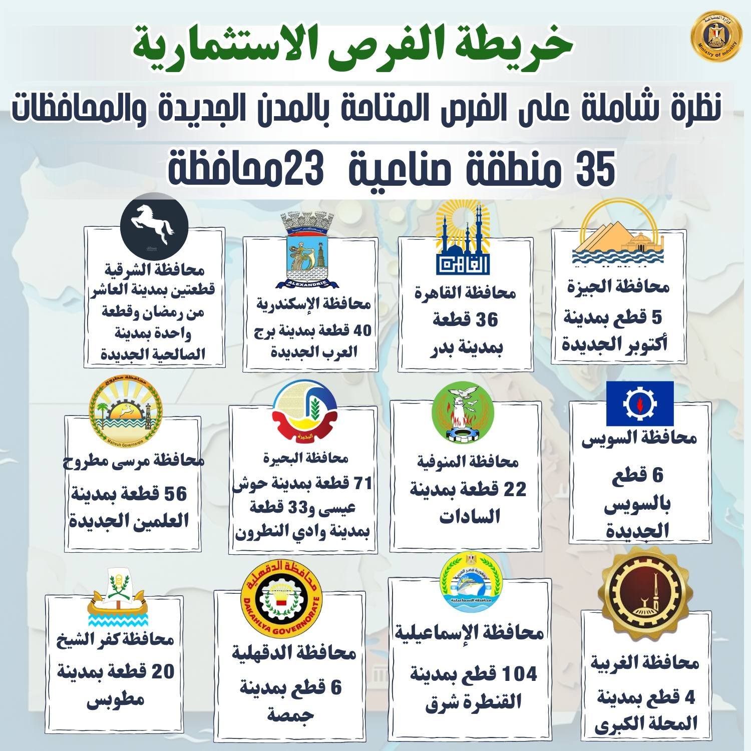 – جاء توزيع الأراضي المطروحة كالتالي: 5 قطع بمدينة أكتوبر الجديدة بمحافظة الجيزة، و36 قطعة بمدينة بدر بمحافظة القاهرة، و40 قطعة بمدينة برج العرب الجديدة بمحافظة الإسكندرية، وقطعتين بمدينة العاشر من رمضان وقطعة واحدة بمدينة الصالحية الجديدة بمحافظة الشرقية، و6 قطع بمدينة السويس الجديدة بمحافظة السويس، و22 قطعة بمدينة السادات بمحافظة المنوفية، و71 قطعة بمدينة حوش عيسى و33 قطعة بمدينة وادي النطرون بمحافظة البحيرة، و56 قطعة بمدينة العلمين الجديدة بمحافظة مرسى مطروح، و6 قطع بمدينة جمصة بمحافظة الدقهلية، و104 قطع بمدينة القنطرة شرق بمحافظة الإسماعيلية، و4 قطع بمدينة المحلة الكبرى بمحافظة الغربية، و20 قطعة بمدينة مطوبس بمحافظة كفر الشيخ، و11 قطعة بامتداد جنوب الرسوة وقطعتين بجنوب بورسعيد بمحافظة بورسعيد، و52 قطعة بمدينة بئر العبد بمحافظة شمال سيناء، وقطعتين بمدينة بني سويف الجديدة بمحافظة بني سويف، و53 قطعة بمدينة الفيوم الجديدة و7 قطع بمدينة كوم أوشيم بمحافظة الفيوم، و3 قطع بمدينة المطاهرة بمحافظة المنيا، و4 قطع بمدينة دشلوط و80 قطعة بمدينة أسيوط الجديدة بمحافظة أسيوط، و159 قطعة بمدينة أخميم الجديدة و5 قطع بمدينة الكوثر و8 قطع بمدينة غرب جرجا و10 قطع بمدينة غرب طهطا بمحافظة سوهاج، و196 قطعة بمدينة نجع حمادي و109 قطع بمدينة قفط بمحافظة قنا، و6 قطع بمدينة البغدادي و119 قطعة بمدينة طيبة الجديدة بمحافظة الأقصر، و35 قطعة بمدينة توشكى الجديدة و3 قطع بمنطقة العلاقي وقطعة واحدة بمدينة كوم أمبو بمحافظة أسوان، وقطعة واحدة بمدينة الداخلة بمحافظة الوادي الجديد.