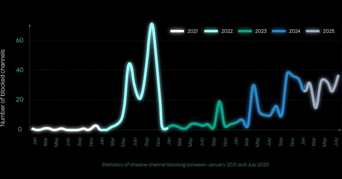 توصل باحثو كاسبرسكي إلى اتجاهين واضحين مرتبطين بالأنشطة غير القانونية في تيليجرام. فقد ازداد متوسط مدة بقاء القنوات الإجرامية الخفية؛ إذ تضاعفت نسبة القنوات التي استمرت لأكثر من 9 شهور بأكثر من ثلاثة أضعاف خلال الفترة بين 2023 و2024، وذلك بالمقارنة مع الفترة ذاتها بين 2021 و2022. ولوحظ في الوقت نفسه ارتفاع وتيرة عمليات الحظر في تيليجرام بشكل واضح. وتقارب أرقام الإزالة والحظر الشهرية المسجلة منذ أكتوبر 2024 -حتى في أدنى مستوياتها- مستويات الذروة عام 2023، وتسارعت وتيرتها العامة خلال عام 2025، مما أعاق الأنشطة الخبيثة.