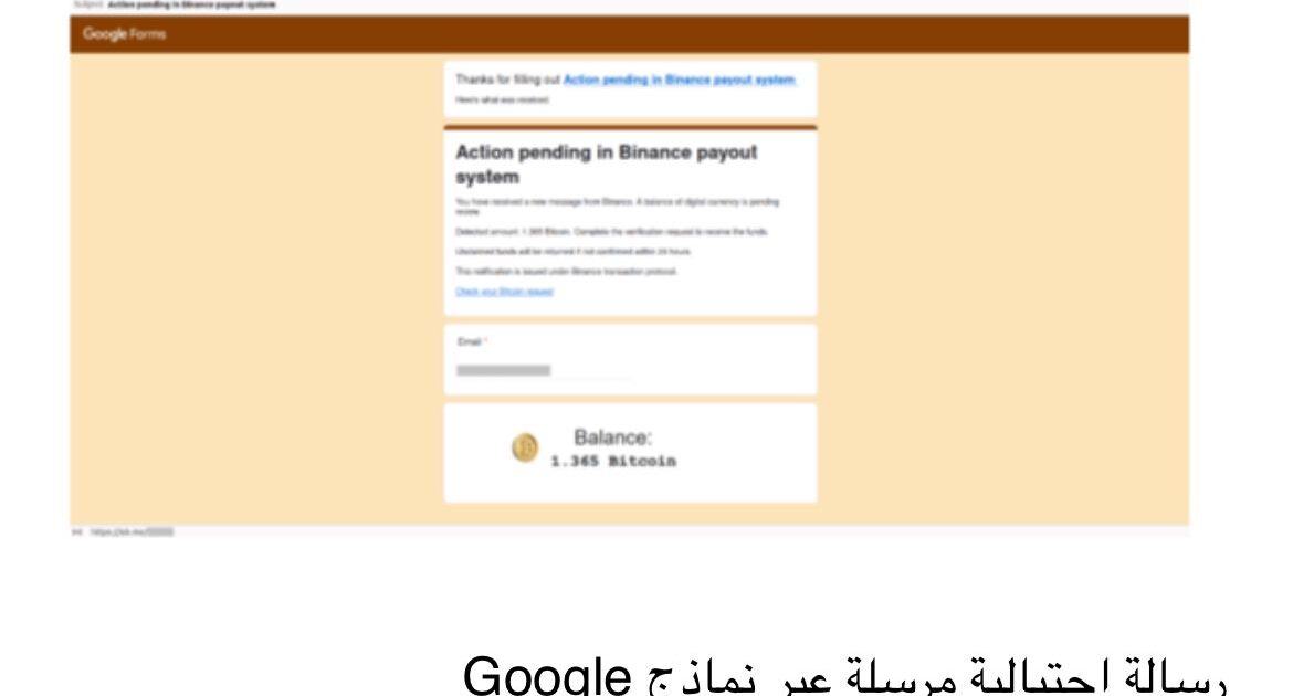 استخدم المهاجمون نماذج Google وهي أداة مجانية لإنشاء الاستبيانات عبر الإنترنت لإنشاء نموذج قصير يحتوي على خانة واحدة فقط: عنوان البريد الإلكتروني. ثم يقوم المهاجمون بإدخال عنوان الضحية في النموذج، وتقوم Google Forms بإرسال تأكيد تقديم النموذج تلقائيًا إلى الضحية. وقد صمم المهاجمون هذا الإشعار ليبدو وكأنه رسالة من خدمة معاملات العملات الرقمية، تتضمن مبلغًا مزعوماً سيتم تحويله، وتحث المستخدم على النقر على الرابط لاستلام التحويل قبل أن “ينتهي صلاحيته”.