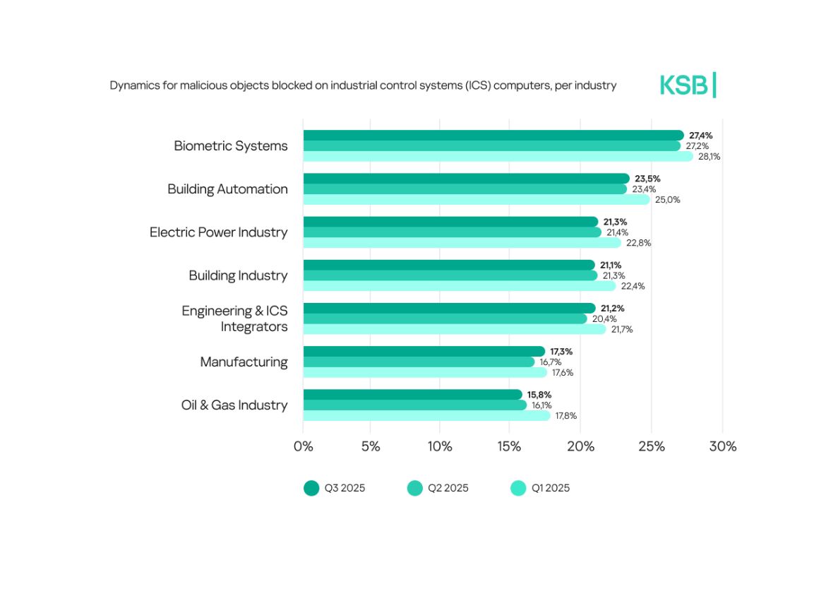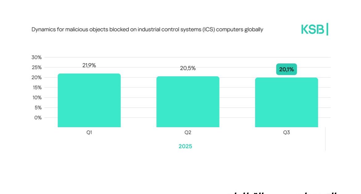 تعرضت بيئات العمل الصناعية إلى ضغوط متزايدة خلال عام 2025، وظهر ذلك في التعقيد المتنامي لديناميكيات التهديدات العالمية. فقد ظلت نسبة أجهزة التحكم الصناعية التي تعرضت إلى هجمات برمجيات خبيثة مرتفعةً، وذلك وفقاً لتقرير كاسبرسكي الأمني؛ إذ بلغت 21.9% خلال الربع الأول، ثم انخفضت إلى 20% بحلول الربع الثالث. ويدل هذا الأمر على تحسن تدريجي في الوسائل الدفاعية الأمنية للمؤسسات، في حين يواصل المهاجمون تطوير أساليبهم باستمرار. وتشهد النتائج تفاوتاً بين المناطق؛ إذ شهدت إفريقيا وجنوب شرق آسيا وشرق آسيا والشرق الأوسط وجنوب آسيا أعلى نسب للهجمات على أجهزة أنظمة التحكم الصناعي.