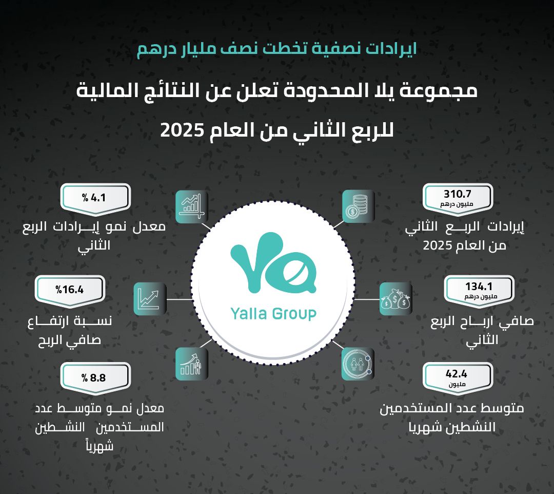 أعلنت مجموعة يلا المحدودة، التي تتخذ من دولة الإمارات العربية المتحدة مقراً لها والمدرجة في بورصة نيويورك، اليوم عن نتائجها المالية للربع الثاني من العام 2025، المنتهي في 30 يونيو.