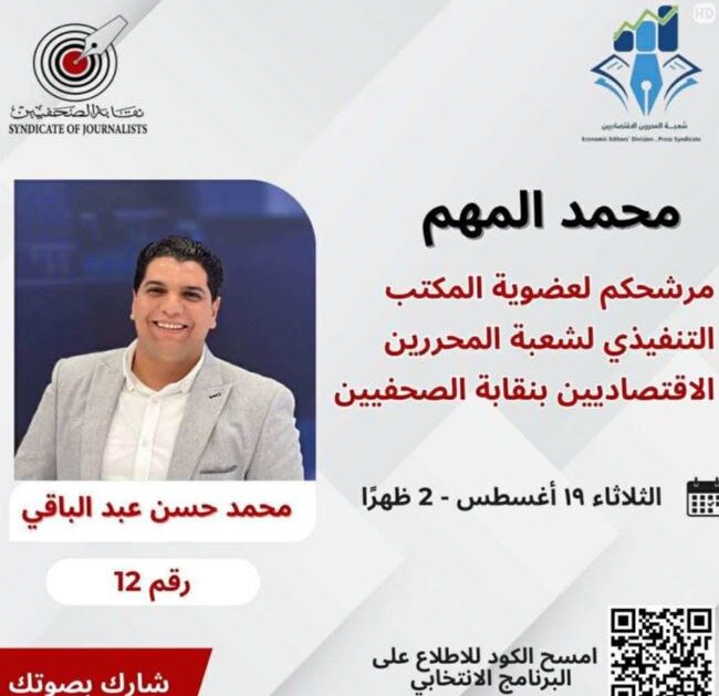 وقال الزميل محمد المهم، المُدرج اسمه في الكشوف الانتخابية باسم “محمد حسن عبد الباقي” رقم (12)، إن برنامجه الانتخابي يرتكز على مجموعة من المحاور العملية، التي تستجيب لاحتياجات الزملاء، وتستند إلى تجربته اليومية في العمل الصحفي، سواء في الصحافة المطبوعة أو الرقمية أو الإعلام المرئي.