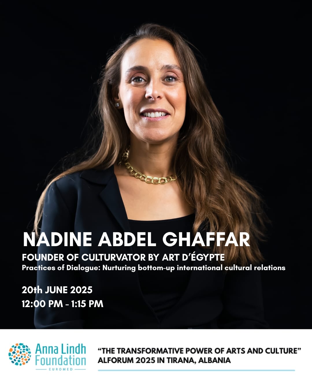 أعلنت أرت دي إيجيبت عن فخرها بمشاركة مؤسِّستها والرائدة الثقافية نادين عبد الغفار كممثلة لمصر ضمن قائمة المتحدثين المرموقين في منتدى مؤسسة آنا ليند 2025، المقرر انعقاده في العاصمة الألبانية تيرانا خلال الفترة من 18 إلى 20 يونيو. وتشارك عبد الغفار في جلسة نقاشية يوم 20 يونيو إلى جانب نخبة من القادة العالميين والروّاد الثقافيين وصنّاع التغيير في منطقة إقليم البحر المتوسط الأوروبي.