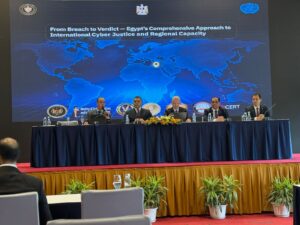 وخلال الجلسة الحوارية رفيعة المستوى، استعرض الوفد المصرى النهج الشامل للدولة المصرية فى تحقيق العدالة السيبرانية الدولية، وبناء القدرات الإقليمية فى مجالات الأدلة الرقمية والتحقيقات السيبرانية.
