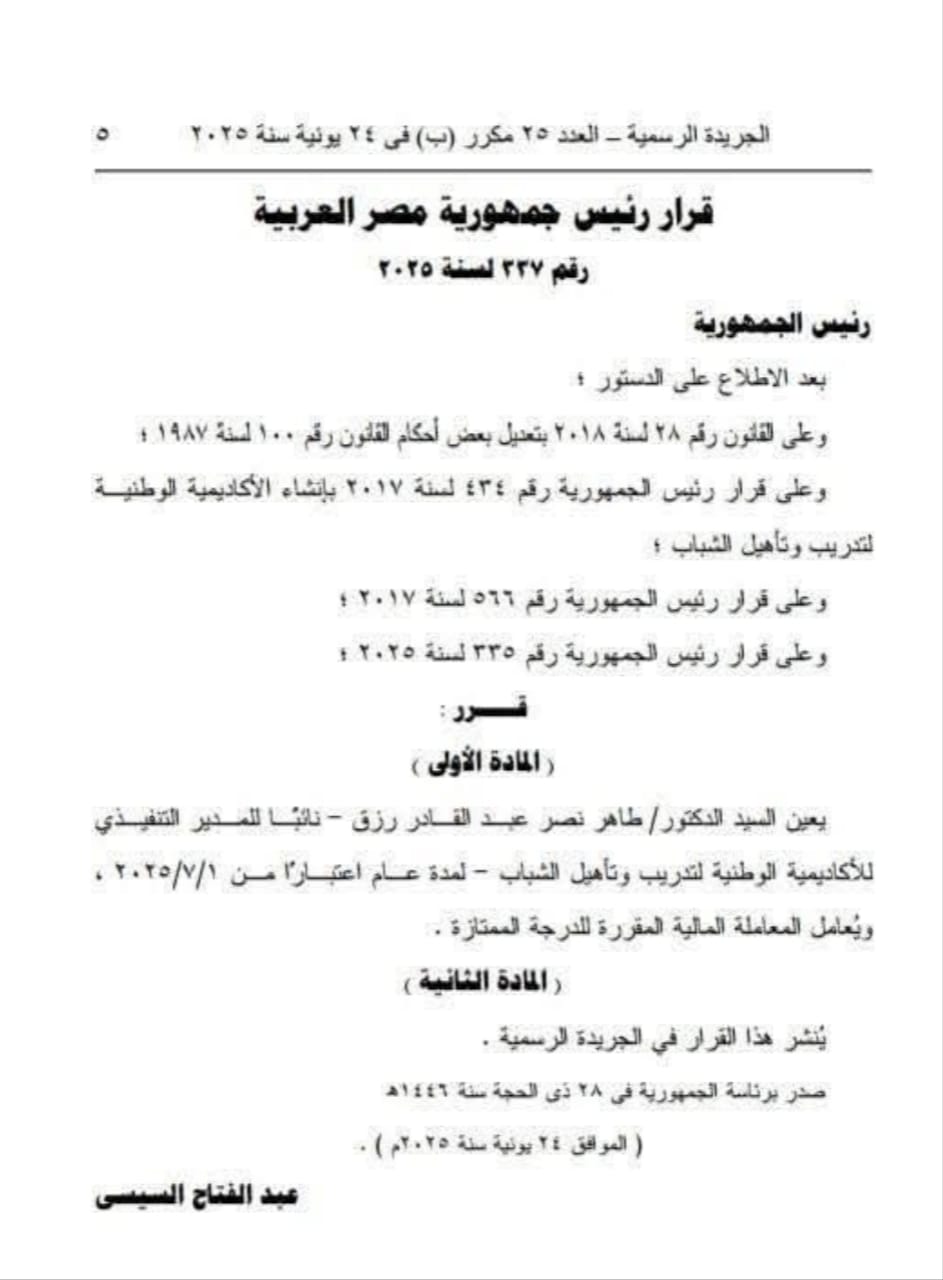 متابعة القراءةاصدر السيد رئيس الجمهورية قرار بتعيين: ١- الدكتورة سلافة أحمد أحمد جويلي مديرا تنفيذيا للأكاديمية الوطنية للتدريب وتأهيل الشباب. ٢- الدكتور طاهر نصر رزق نائبا للمدير التنفيذي للأكاديمية. كما صدر قرار بتشكيل مجلس الامناء برئاسة السيد رئيس الجمهورية ويضم المجلس: ١- رئيس الوزراء ٢- وزير التخطيط والتنمية الاقتصادية والتعاون الدولي
