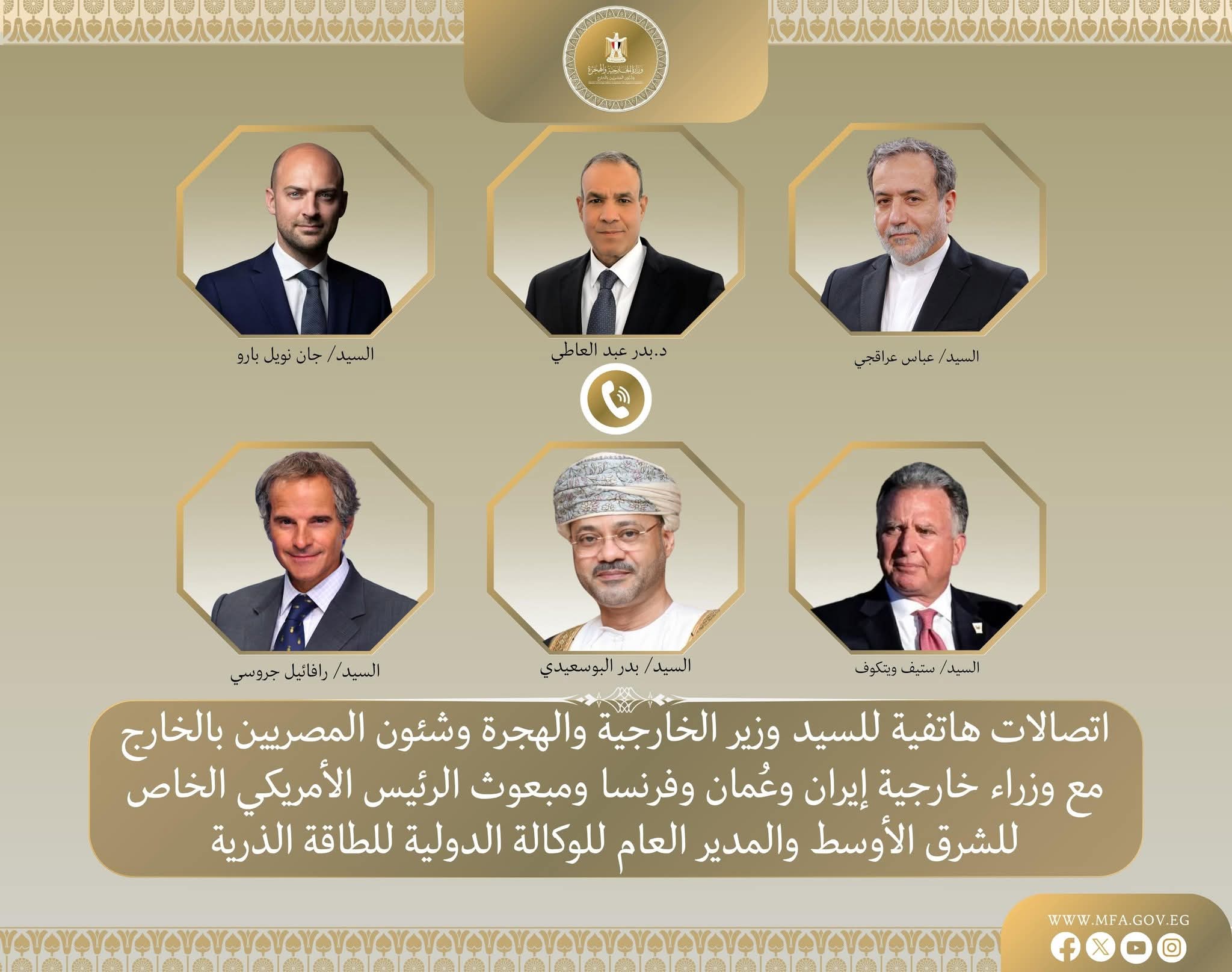متابعة القراءةفي إطار توجيهات السيد رئيس الجمهورية بتكثيف الاتصالات مع الأطراف الإقليمية والدولية لخفض التصعيد وتحقيق التهدئة في المنطقة ودعم الأمن والاستقرار بالشرق الأوسط، أجرى د. بدر عبد العاطي وزير الخارجية والهجرة مساء أمس ٤ يوليو وصباح اليوم ٥ يوليو سلسلة من الاتصالات مع السيد عباس عراقجي وزير الخارجية الإيراني، والسيد