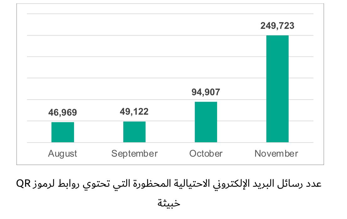 أشارت كاسبرسكي إلى ارتفاع ملحوظ في رسائل البريد الإلكتروني الاحتيالية التي تتضمن رموز (QR) خبيثة. فقد ازداد عدد الحالات المكتشفة بنحو خمسة أضعاف من 46,969 حالة في شهر أغسطس إلى 249,723 حالة في شهر نوفمبر، ويعود السبب في ذلك إلى استغلال المجرمين السيبرانيين المتزايد لرموز (QR). يستخدم المجرمون هذه الرموز في رسائل البريد الإلكتروني لأنها وسيلة فعالة ورخيصة التكلفة لإخفاء عناوين المواقع الإلكترونية الخبيثة، وبذلك يتفادون اكتشافهم بواسطة حلول أمنية كثيرة.