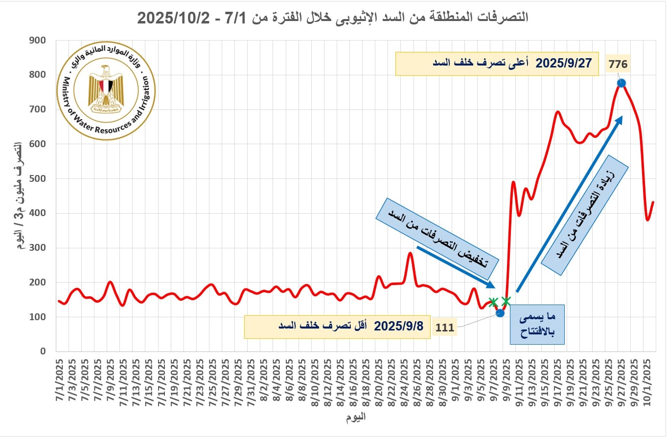 أكدت وزارة الموارد المائية والري المصرية متابعتها الدقيقة لتطورات فيضان نهر النيل لهذا العام، مشيرةً إلى أن التصرفات الأحادية التي اتخذتها إثيوبيا في إدارة سد النهضة تفتقر إلى الحد الأدنى من الشفافية والمسؤولية، وتمثل انتهاكًا صارخًا للقانون الدولي ومبادئ حسن الجوار، وتشكل خطرًا مباشرًا على حياة شعوب دولتي المصب، مصر