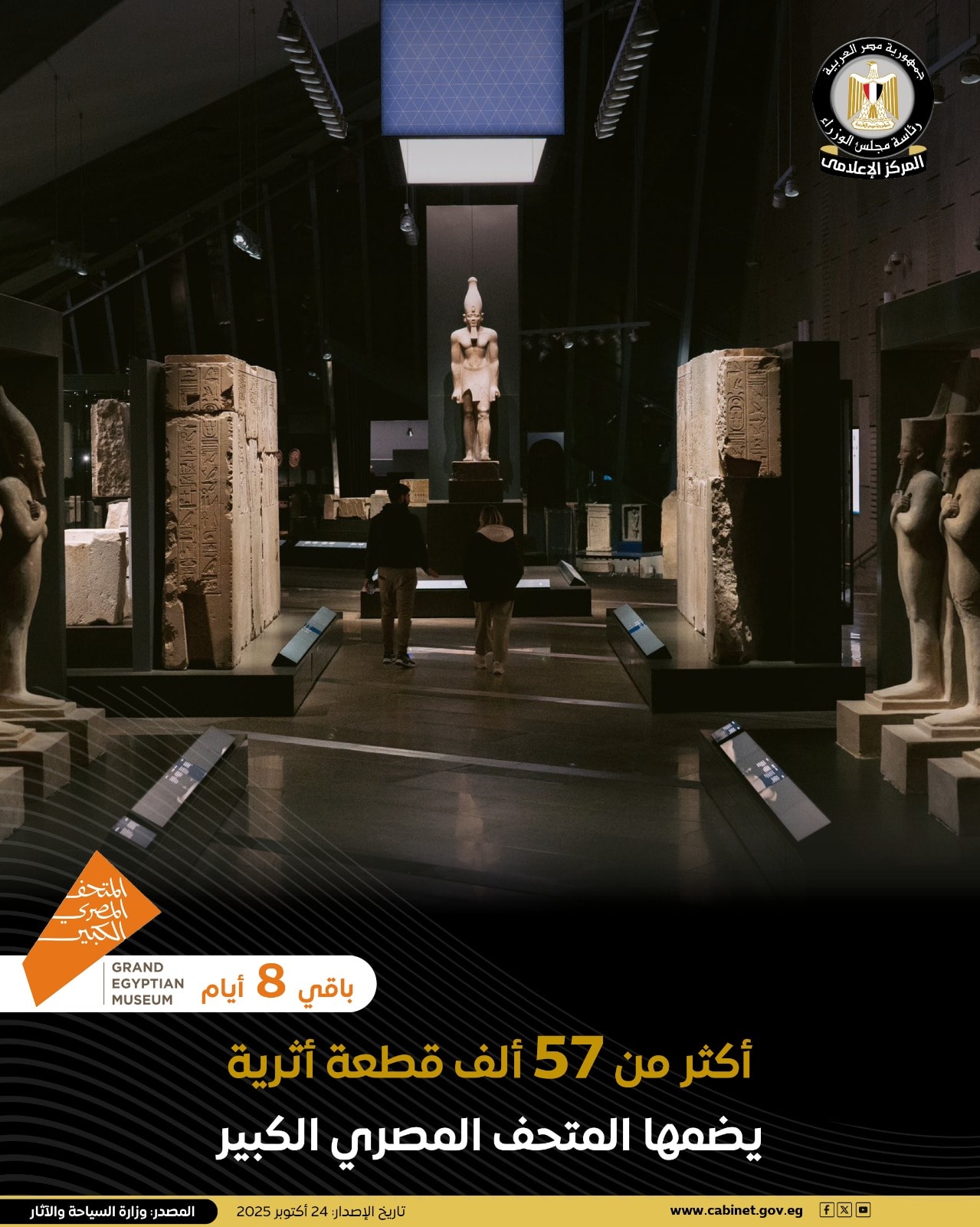 متابعة القراءةنشر المركز الإعلامي لمجلس الوزراء عددًا من الإنفوجرافات عبر منصاته على مواقع التواصل الاجتماعي، بعنوان "المتحف المصري الكبير.. هدية مصر للعالم.. استعدادات وتجهيزات مكثفة تمهيدًا لافتتاحه". ومع اقتراب موعد افتتاح المتحف المصري الكبير، تتأهب مصر لإطلاق حدث عالمي طال انتظاره، يمثل تتويجًا لسنوات من العمل المتواصل ونقلة نوعية في عرض
