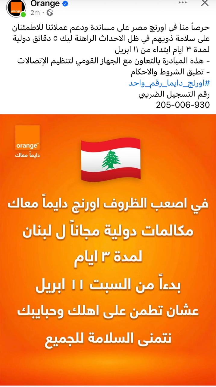 متابعة القراءةأعلنت شركة Orange Egypt عن إطلاق مبادرة لدعم عملائها، تتيح إجراء مكالمات دولية مجانية إلى لبنان لمدة ثلاثة أيام، بدءًا من 11 أبريل. وأوضحت الشركة أن هذه الخطوة تأتي في إطار حرصها على تمكين العملاء من الاطمئنان على ذويهم خلال الظروف الحالية، وذلك بالتعاون مع الجهاز القومي لتنظيم الاتصالات. وأكدت