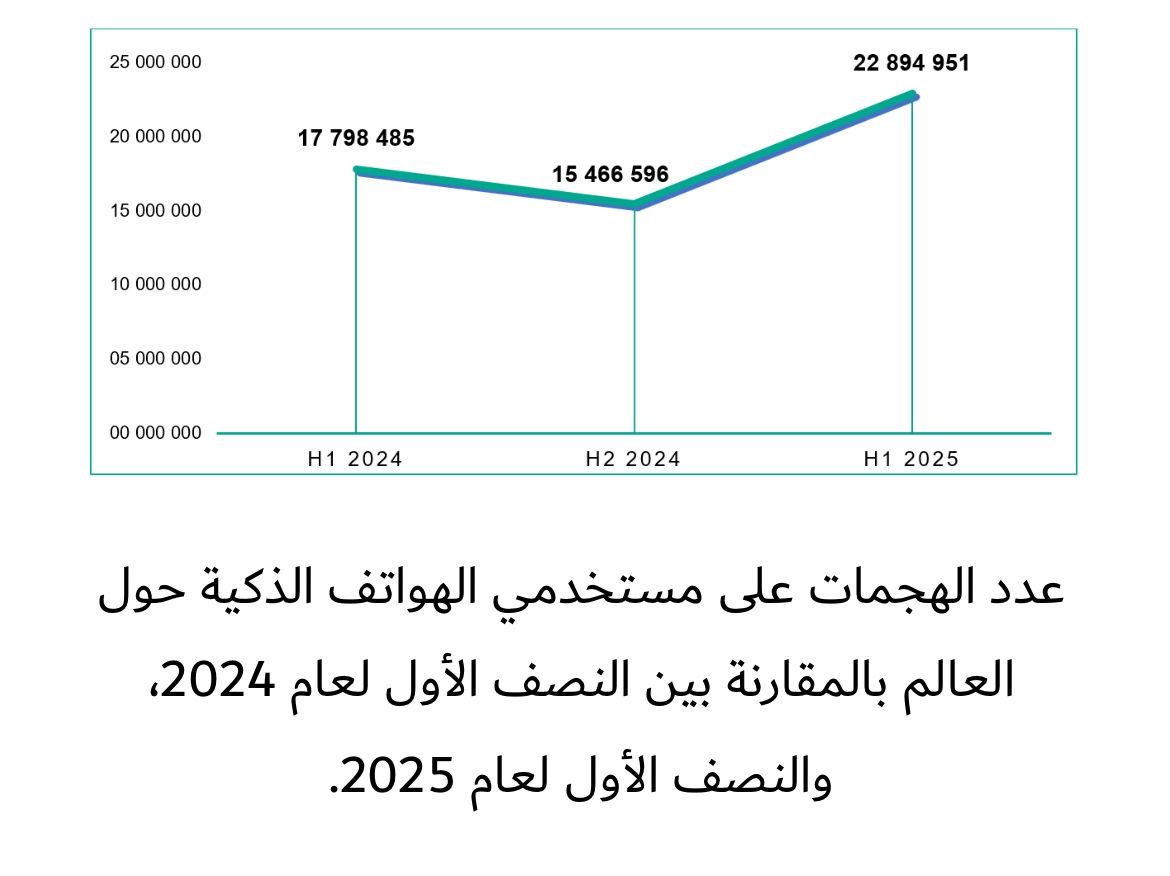كشف تقرير كاسبرسكي عن ارتفاع الهجمات التي تستهدف مستخدمي الهواتف الذكية العاملة بنظام أندرويد بنسبة 29% خلال النصف الأول لعام 2025 مقارنة بالفترة نفسها لعام 2024، وبنسبة 48% مقارنة بالنصف الثاني لعام 2024. ورصدت كاسبرسكي خلال عام 2025 مجموعة من التهديدات السيبرانية للهواتف الذكية مثل البرمجيات الخبيثة SparkCat وSparkKitty وTriada،