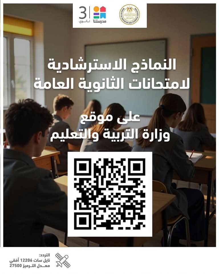 فى ضوء توجيهات محمد عبد اللطيف وزير التربية والتعليم والتعليم الفني بتقديم خدمة تعليمية متميزة لأبنائنا طلاب الثانوية العامة، تعلن وزارة التربية والتعليم والتعليم الفنى إتاحة النماذج الاسترشادية لامتحانات الثانوية العامة اليوم على موقع الوزارة، على أن يتم إتاحة مادة يوميا عبر الرابط التالي: https://content.moe.gov.eg/qa كما تعلن الوزارة إتاحة حل