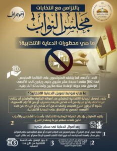 وفي حلقة اليوم تجيب وزارة الشؤون النيابية والقانونية والتواصل السياسي عن كل الأسئلة التي تتعلق بالدعاية الانتخابية،، ومحظوراتها، وحدود الإنفاق، والصمت الدعائي، في شكل إنفوجراف، حتى تكون عملية الاطلاع سهلة ومختصرة أمام المواطن.