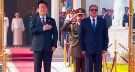 وصل الرئيس الكوري الجنوبي لي جاي ميون قصر الاتحادية صباح اليوم في زيارة رسمية لمصر، ورافقه مراسم استقبال رسمية تضمنت عزف الموسيقى العسكرية للسلام الوطني لكل من مصر وكوريا الجنوبية.