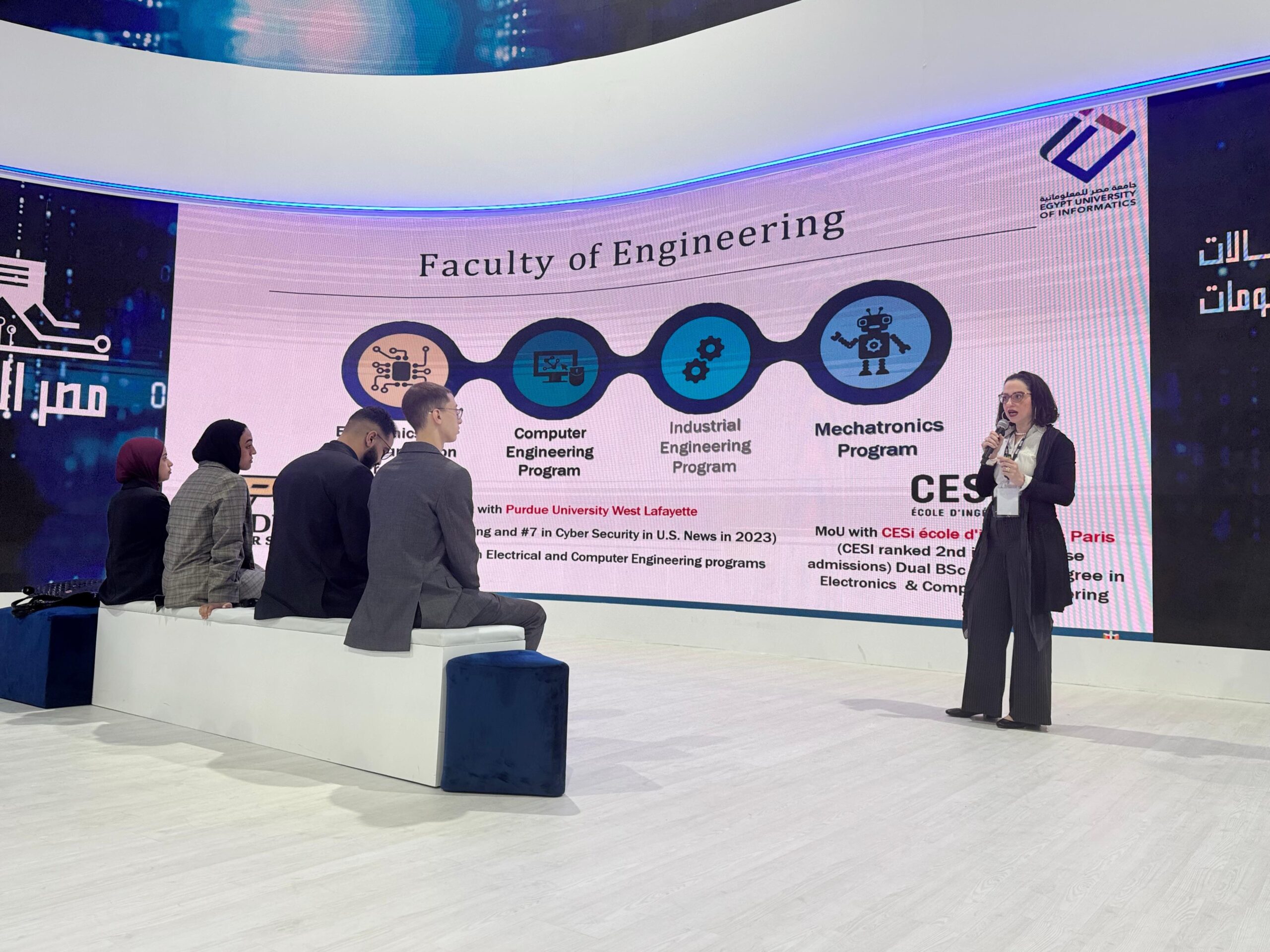 وعرضت خلال ورشة العمل إمكانيات جامعة مصر للمعلوماتية، الإمكانيات المتطورة التي تمتلكها الجامعة من معامل ومراكز بحثية لإعداد متخصصين في اهم مجالات تكنولوجيا المعلومات والاتصالات خاصة الذكاء الاصطناعي وهندسة البيانات وصناعة الالكترونيات وعلوم الاتصالات والميكاترونيكس والروبوتات والتكنولوجيا المالية والتسويق الالكتروني، وفنون الرسوم المتحركة وتصميم الألعاب.